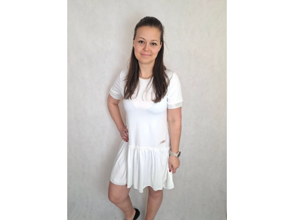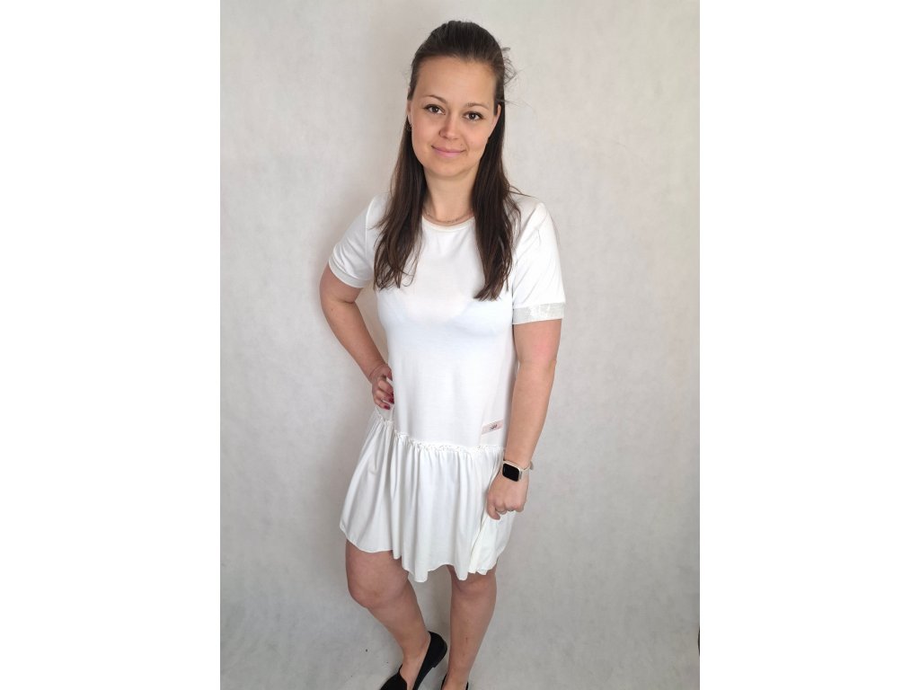Šaty z příjemné bavlny s krátkými rukávy, zdobené třpytivým lemem u výstřihu i rukávů, a doladěné elegantním volánem pro dokonalý vzhled.