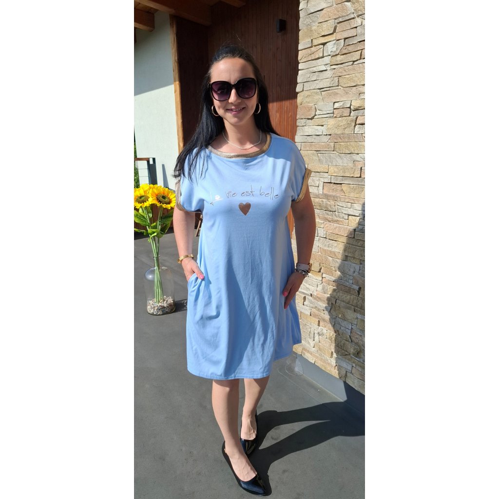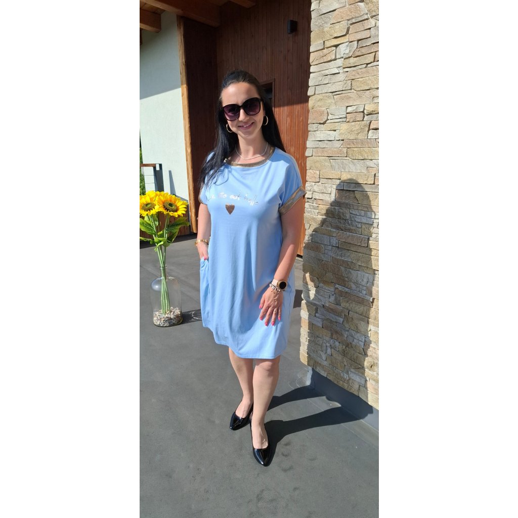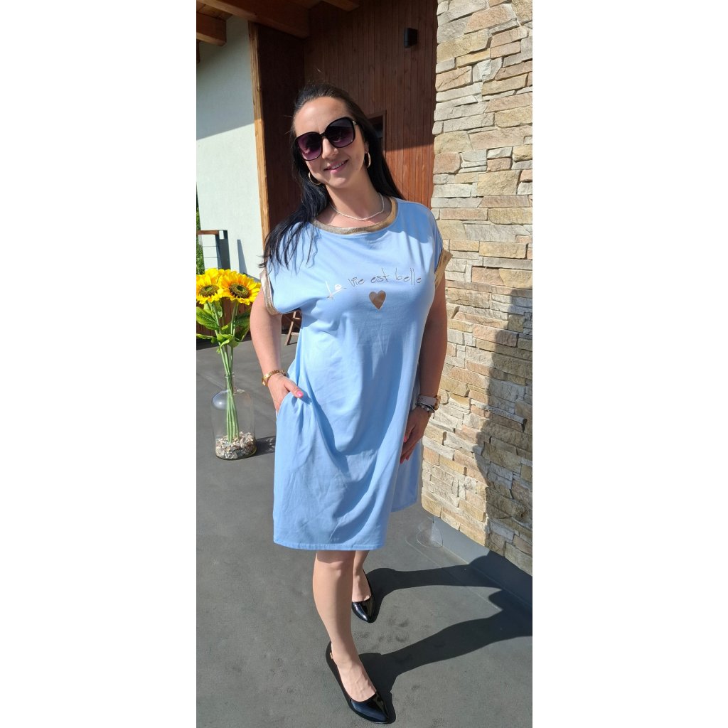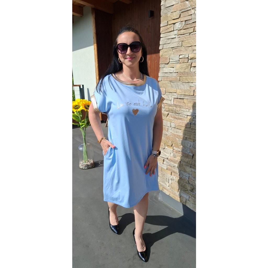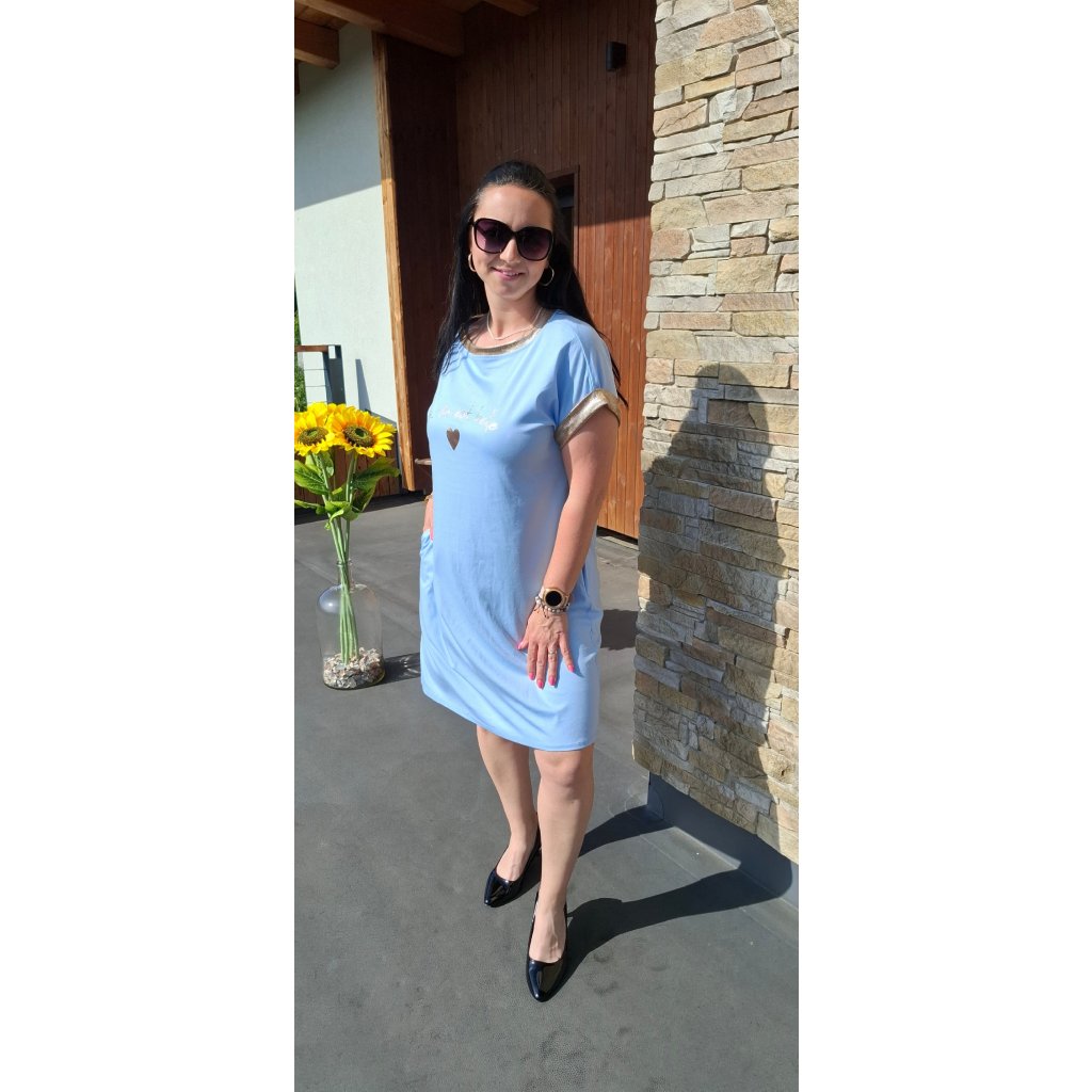 Tyto elegantní modré šaty ke kolenům v sobě spojují pohodlí a styl. Díky univerzální velikosti padnou postavám od S až po XL, zatímco volnější střih zajistí maximální komfort při nošení. Zlatý nápis s třpytivými kamínky na prsou dodává šatům nádech luxusu, který podtrhují také zlaté lemy na krátkých rukávech.