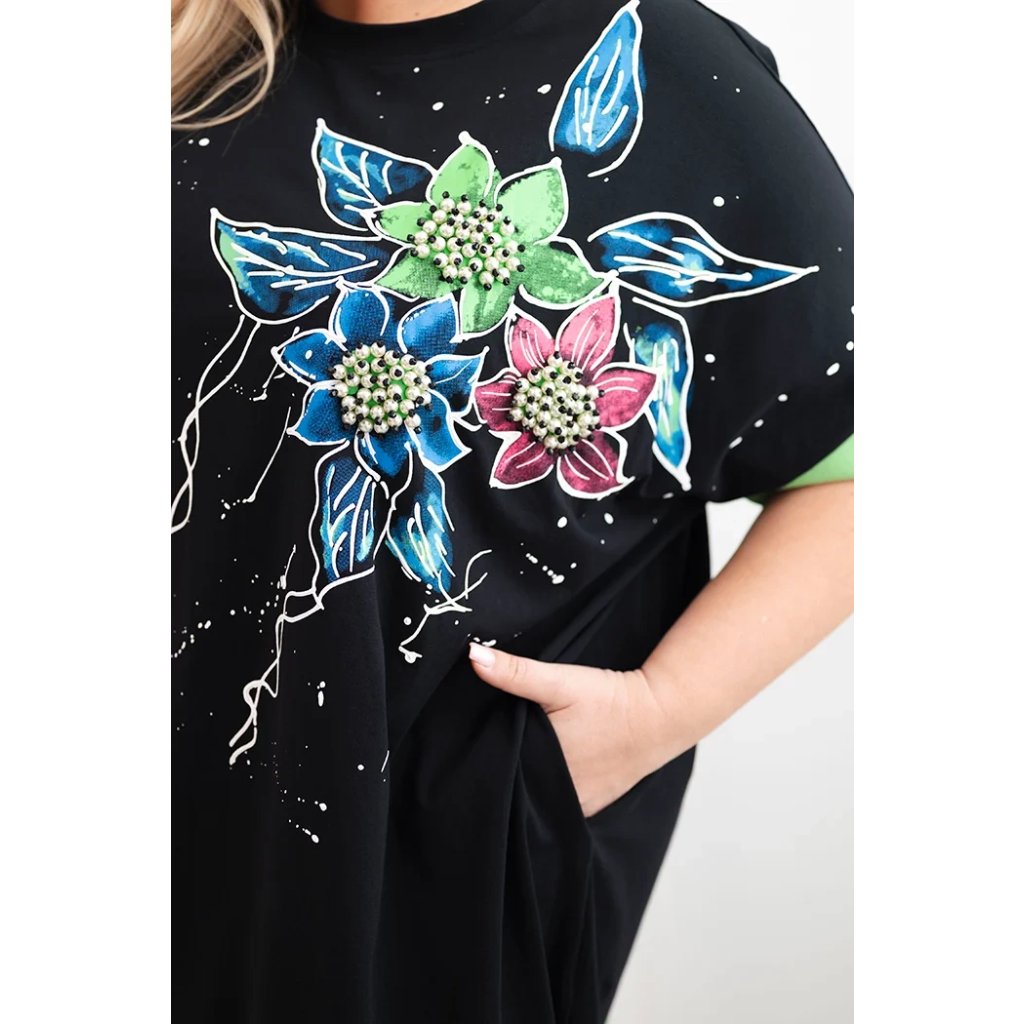 Pokud si ceníte kombinace ženského stylu a pohodlí, tato dámská tunika Plus Size splní Vaše očekávání! Model s volným střihem z příjemné bavlny s příměsí elastanu zajišťuje celodenní komfort. Květinový vzor zdobený perličkami dodává eleganci a kontrastní zakončení rukávů a spodního lemu tuniku odlišuje od ostatních modelů. Skvělá pro každodenní nošení, ale také vhodná pro slavnostnější příležitosti. Ideální pro ženy, které hledají stylová řešení ve velikosti Plus Size. Model určený pro ženy nosící velikosti Plus Size – XXL, XXXL a větší.