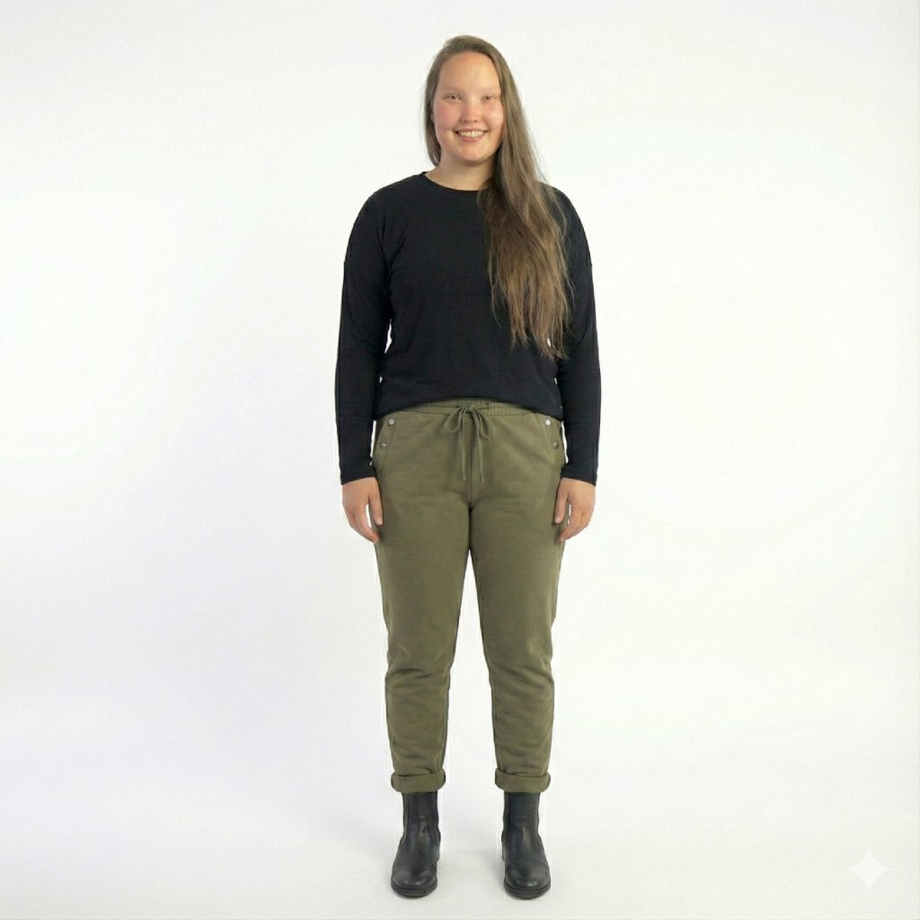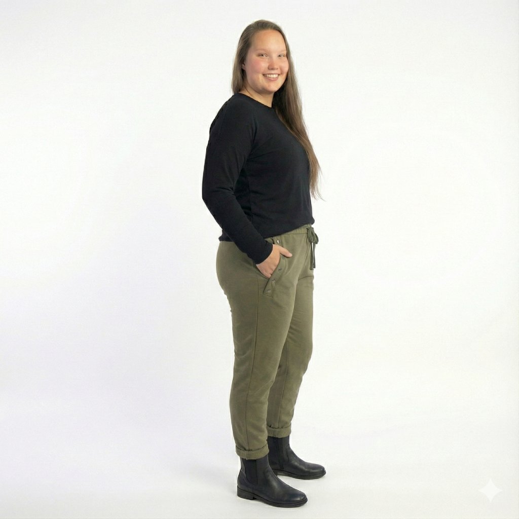Tyto pohodlné teplákové kalhoty z měkkého a poddajného materiálu si zamilujete na doma i na cesty. V pase mají širokou gumu se šňůrkou, díky které se kalhoty krásně přizpůsobí postavě a netlačí ani při celodenním nošení. Střih s mírně zúženou nohavicí a možností ohrnutí spodního lemu opticky zeštíhluje nohy a působí upraveněji než klasické tepláky.