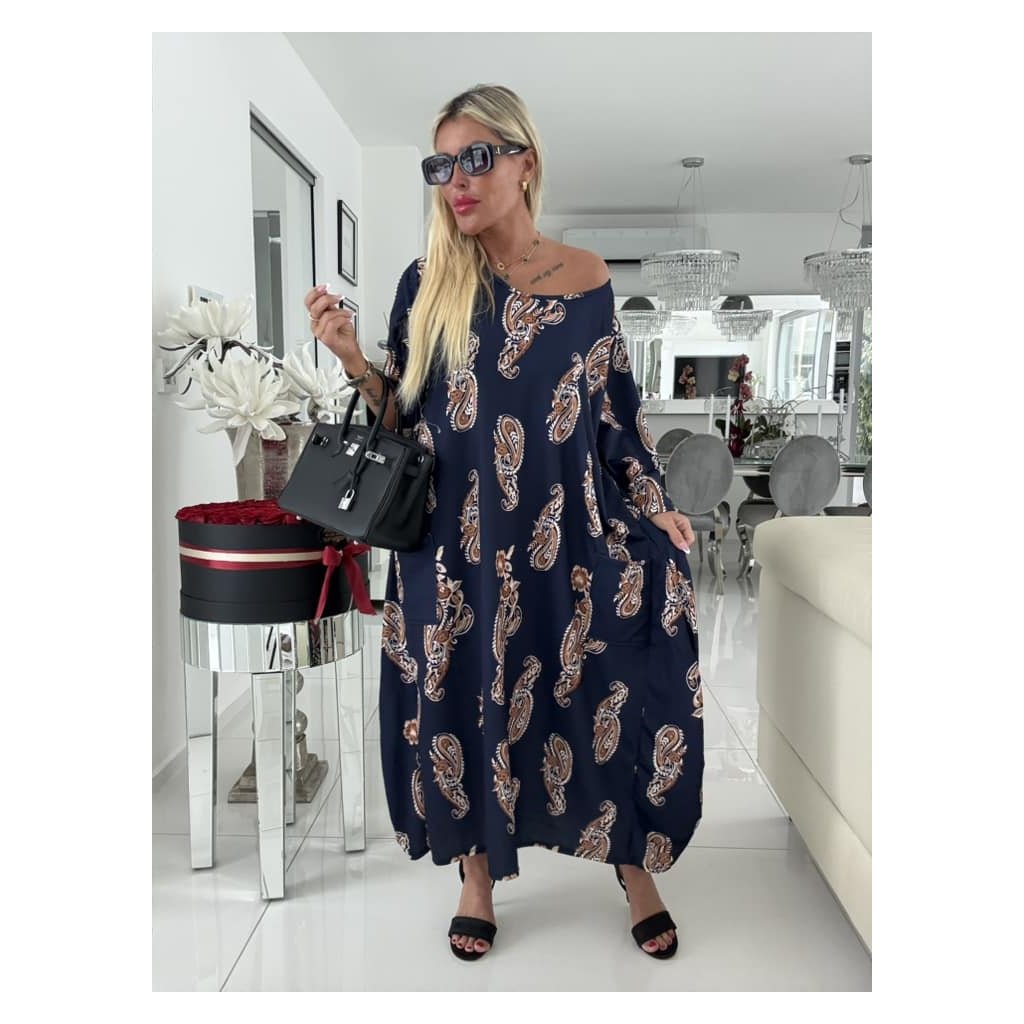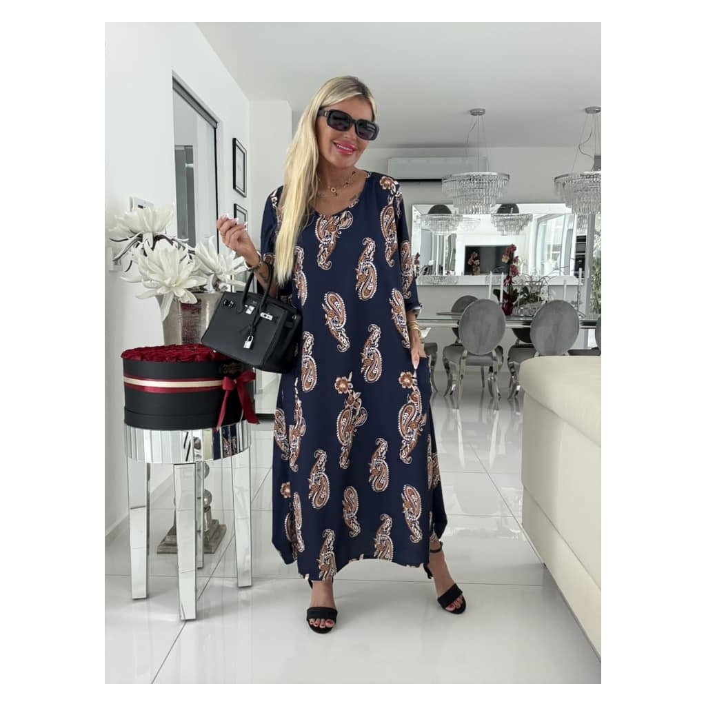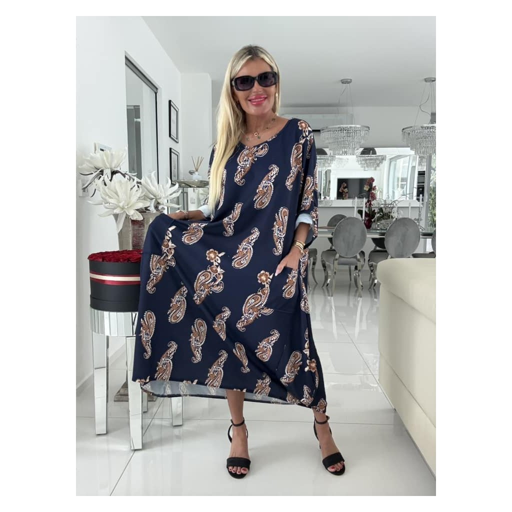 Lehké a vzdušné maxi šaty v modré barvě s výrazným vzorovaným designem. Mají kulatý výstřih, rukávy ke loktům a praktické kapsy na bocích. Díky volnému střihu a pružnému materiálu padnou různým postavám – ideální jako univerzální letní kousek pro velikosti XS až XXL.