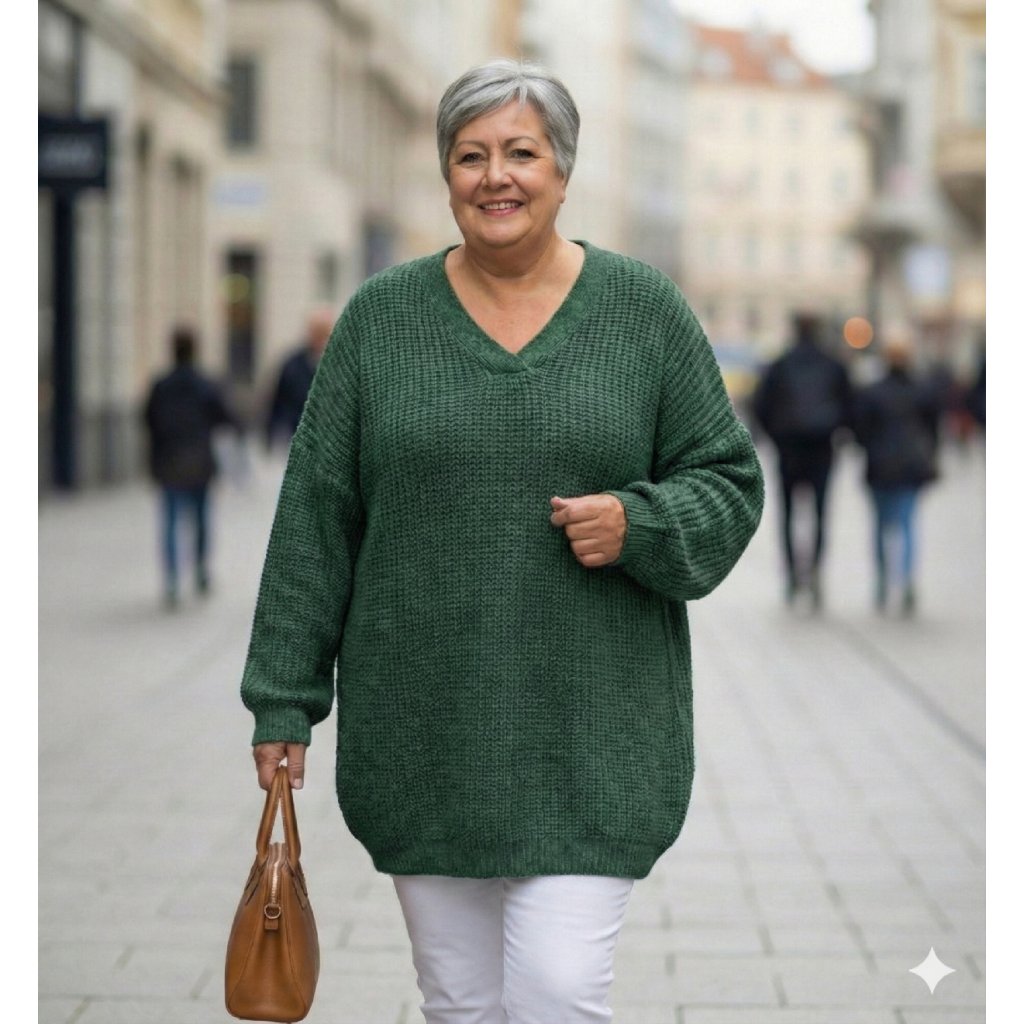Dlouhý pletený svetr v nadměrné velikosti s výstřihem do V krásně zahřeje a lichotí postavě. Univerzální velikost sedí na XL–4XL, obvod prsa 130–170 cm, délka 89 cm. Příjemný úplet z 95 % akryl, 5 % elastan se nemačká a pohodlně se nosí, ideální pro ženy 50+ 60+ 70+.