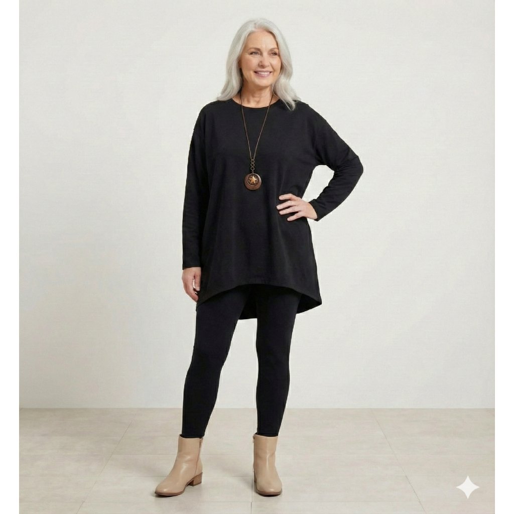 Tato tunika je důkazem, že móda pro plnoštíhlé nemusí být nudná ani neforemná. Její hlavní předností je chytrý asymetrický střih. Přední část je kratší, což opticky prodlužuje nohy, zatímco prodloužený zadní díl (až 96 cm) elegantně zakrývá zadeček a boky, což oceníte zejména při nošení s legínami.
