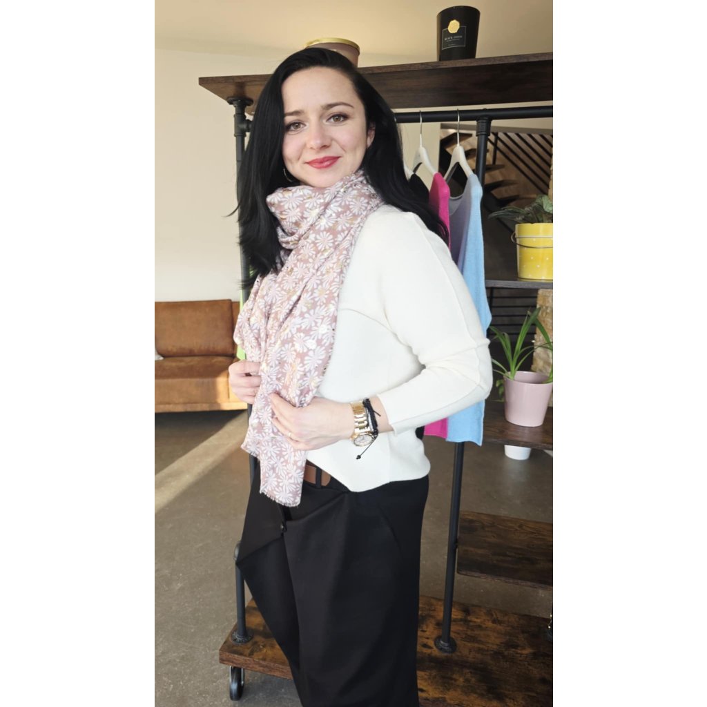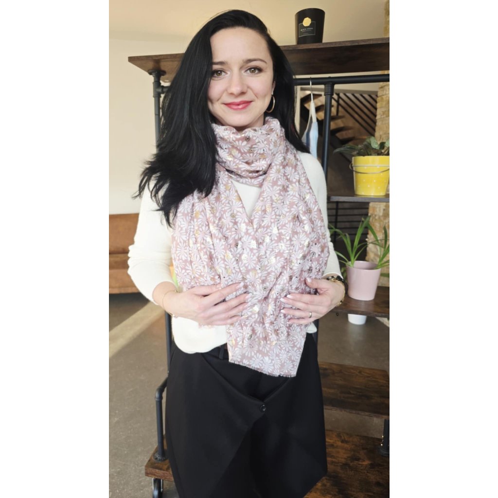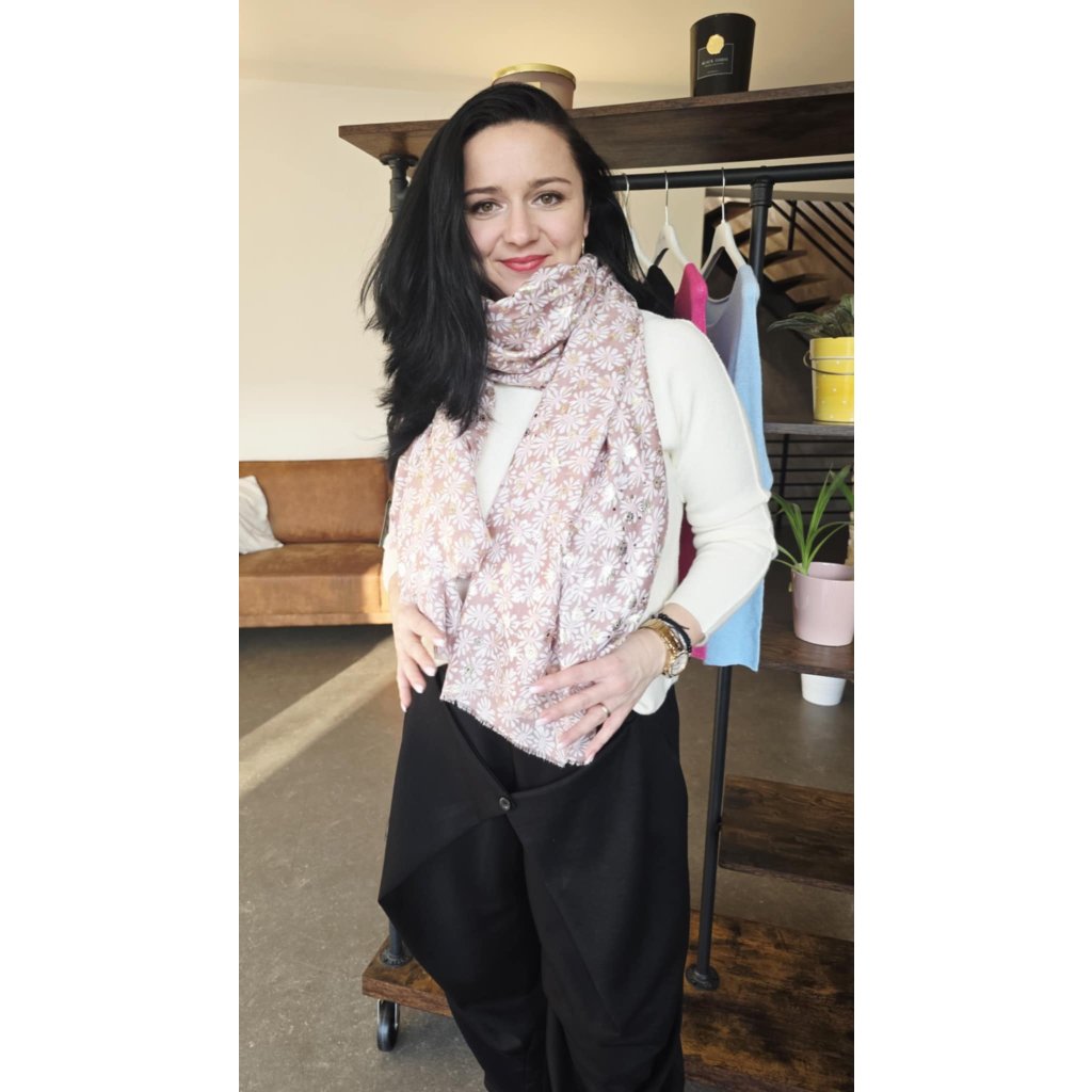 Tento dlouhý a lehký šál s květinami je ideální doplněk pro každodenní nošení i elegantnější kombinace. Jemný vzor doplňuje decentní zlatá nitka, která dodá šálu sofistikovaný lesk bez přehánění. Materiálové složení 50 % viskóza / 50 % bavlna zajišťuje příjemnou měkkost, prodyšnost a komfort při nošení. Díky většímu formátu 170 × 90 cm ho snadno uvážete na více způsobů (na krk, přes ramena nebo volně do „V“ pro prodloužení siluety). Zakončení působí přirozeně a jemně třepeně.