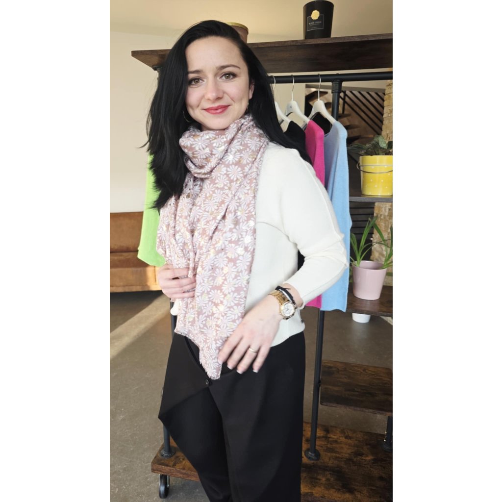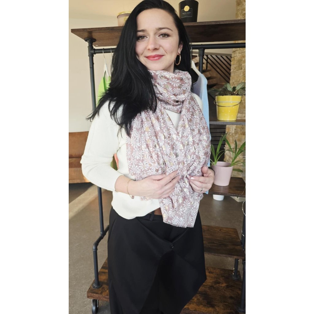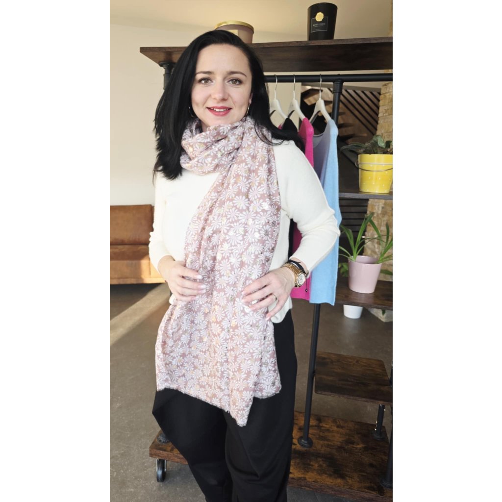 Tento dlouhý a lehký šál s květinami je ideální doplněk pro každodenní nošení i elegantnější kombinace. Jemný vzor doplňuje decentní zlatá nitka, která dodá šálu sofistikovaný lesk bez přehánění. Materiálové složení 50 % viskóza / 50 % bavlna zajišťuje příjemnou měkkost, prodyšnost a komfort při nošení. Díky většímu formátu 170 × 90 cm ho snadno uvážete na více způsobů (na krk, přes ramena nebo volně do „V“ pro prodloužení siluety). Zakončení působí přirozeně a jemně třepeně.