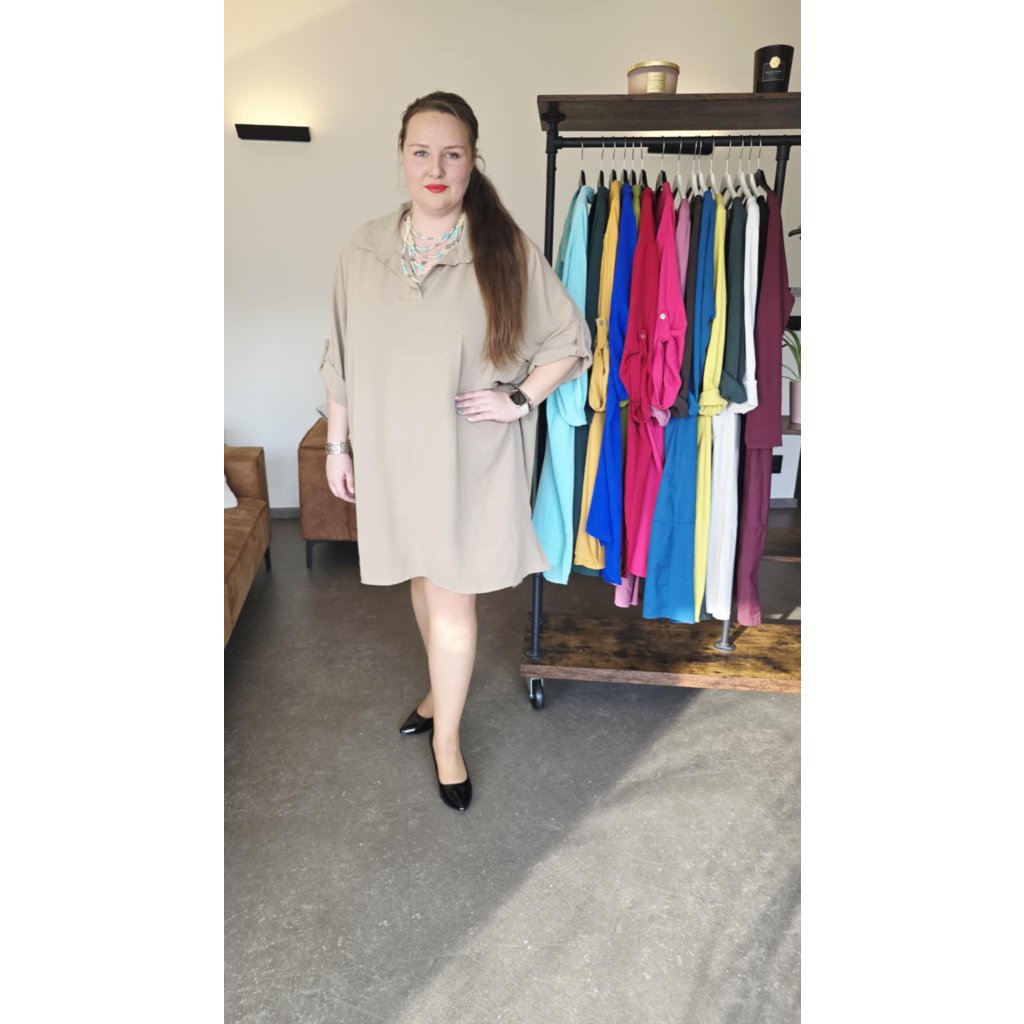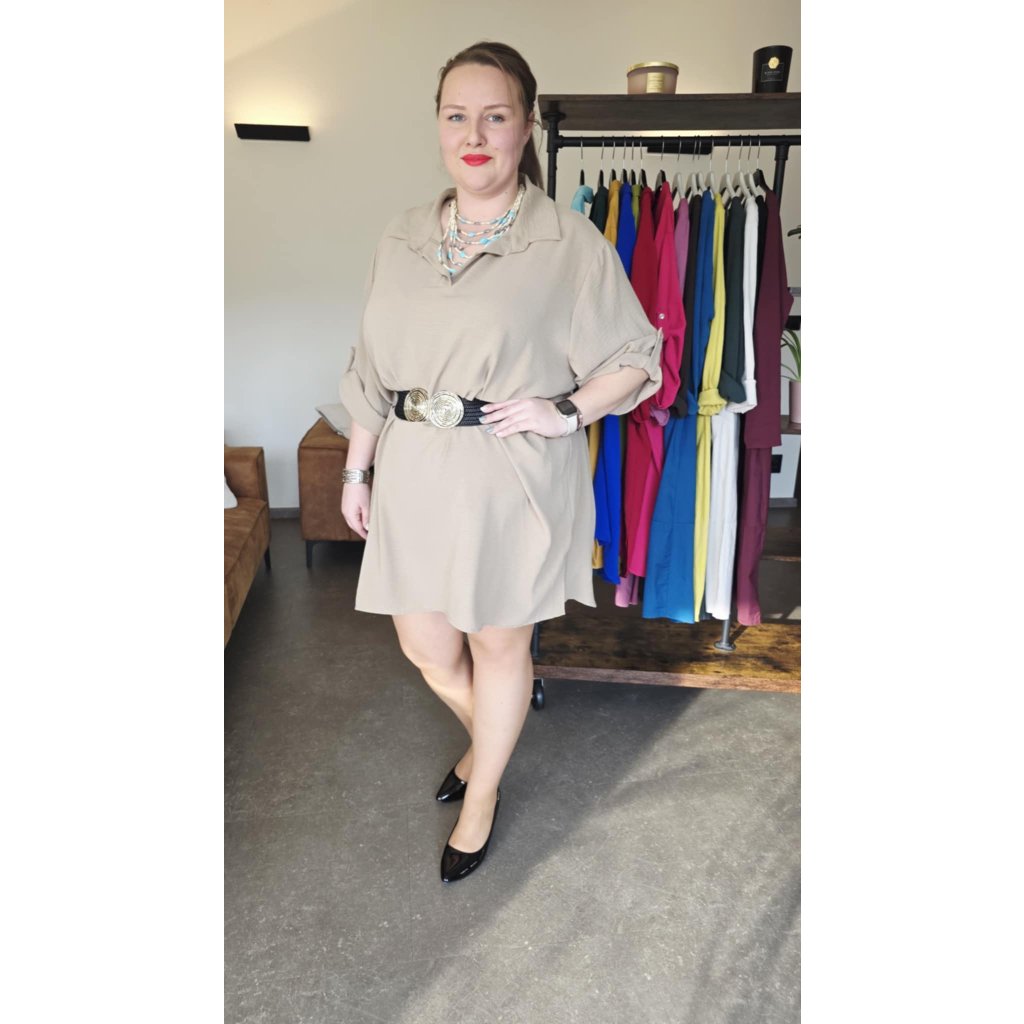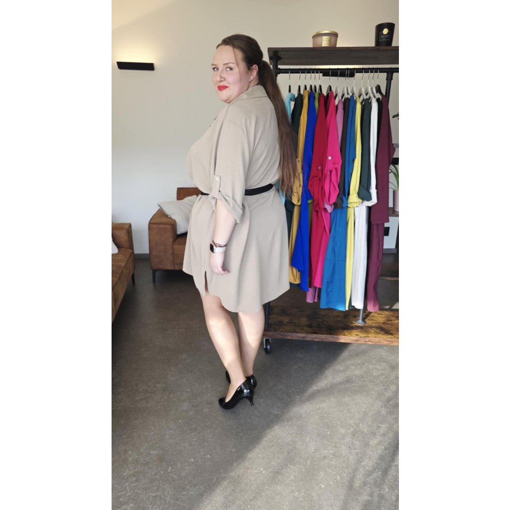 Košilové šaty MAIA béžové košilový střih, prodloužený zadní díl, rukávy na knoflíček, 5XL