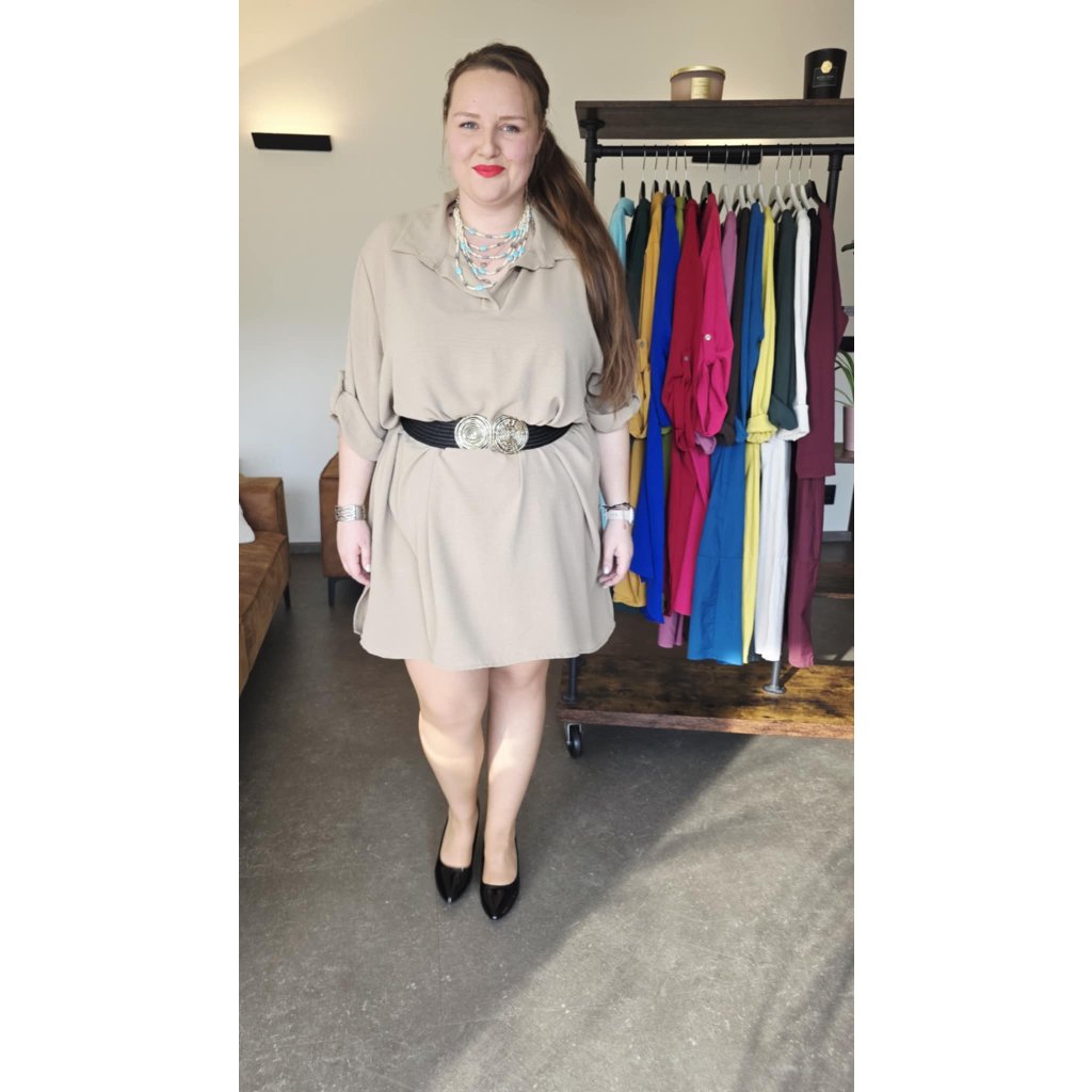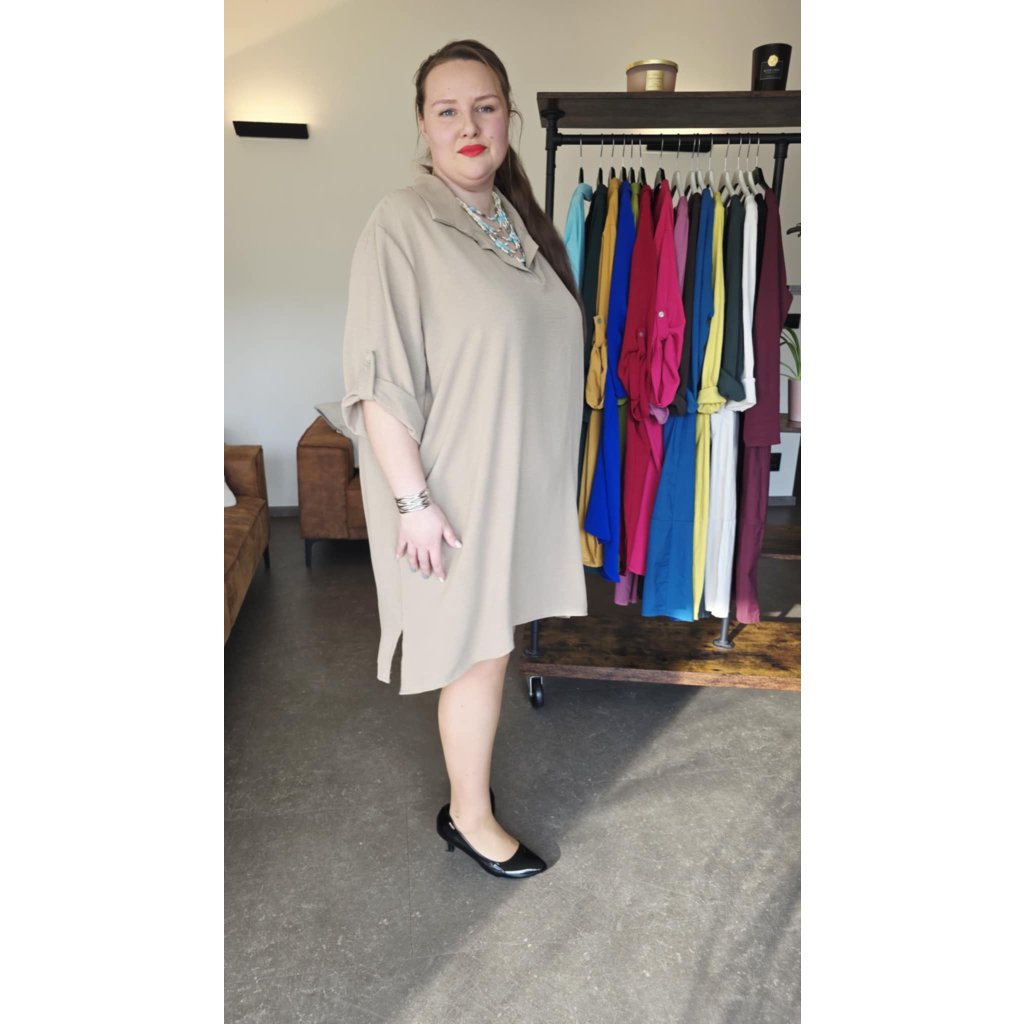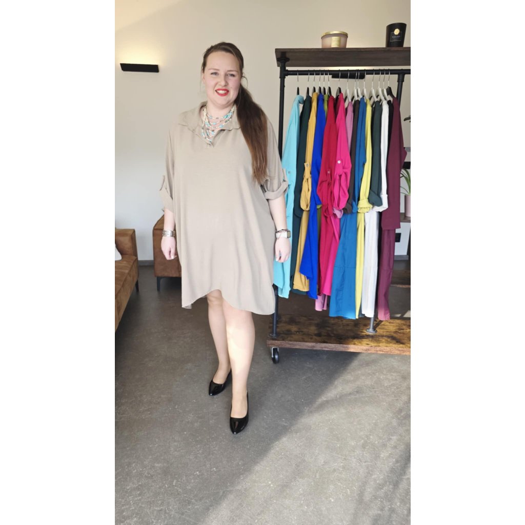 Košilové šaty MAIA béžové košilový střih, prodloužený zadní díl, rukávy na knoflíček, 5XL