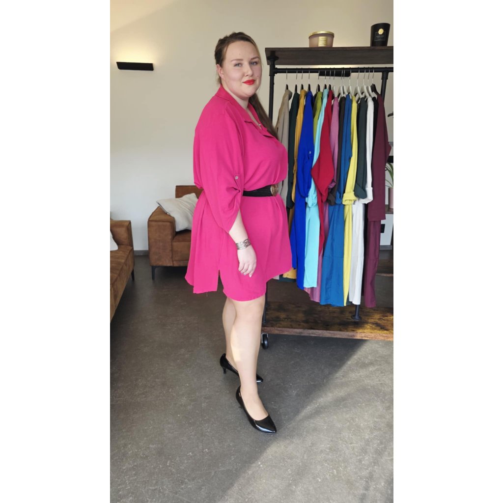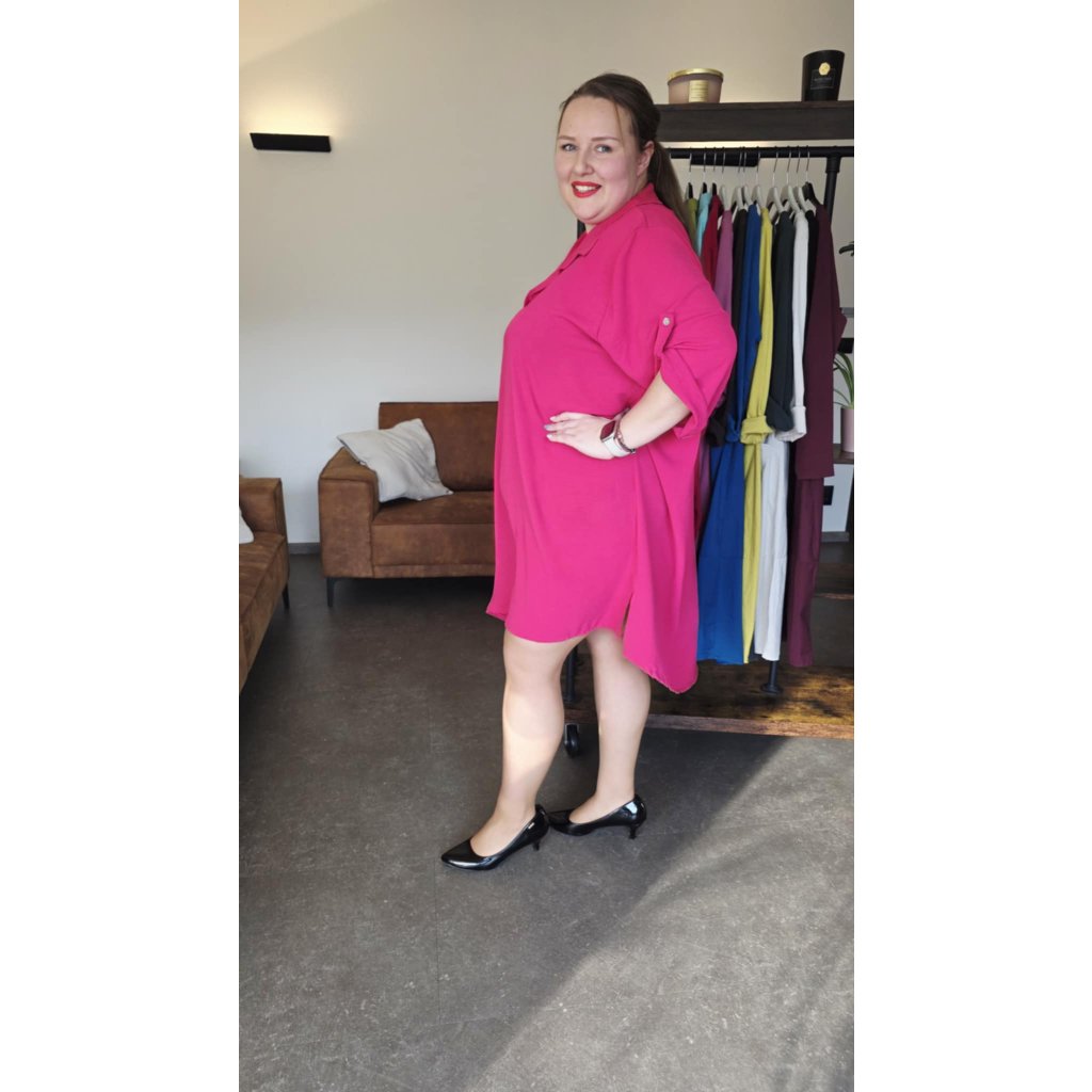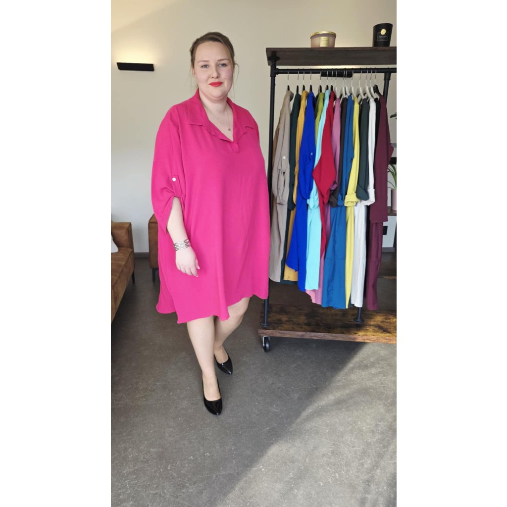 Košilové šaty MAIA fuchsiově růžové košilový střih, prodloužený zadní díl, rukávy na knoflíček, 5XL