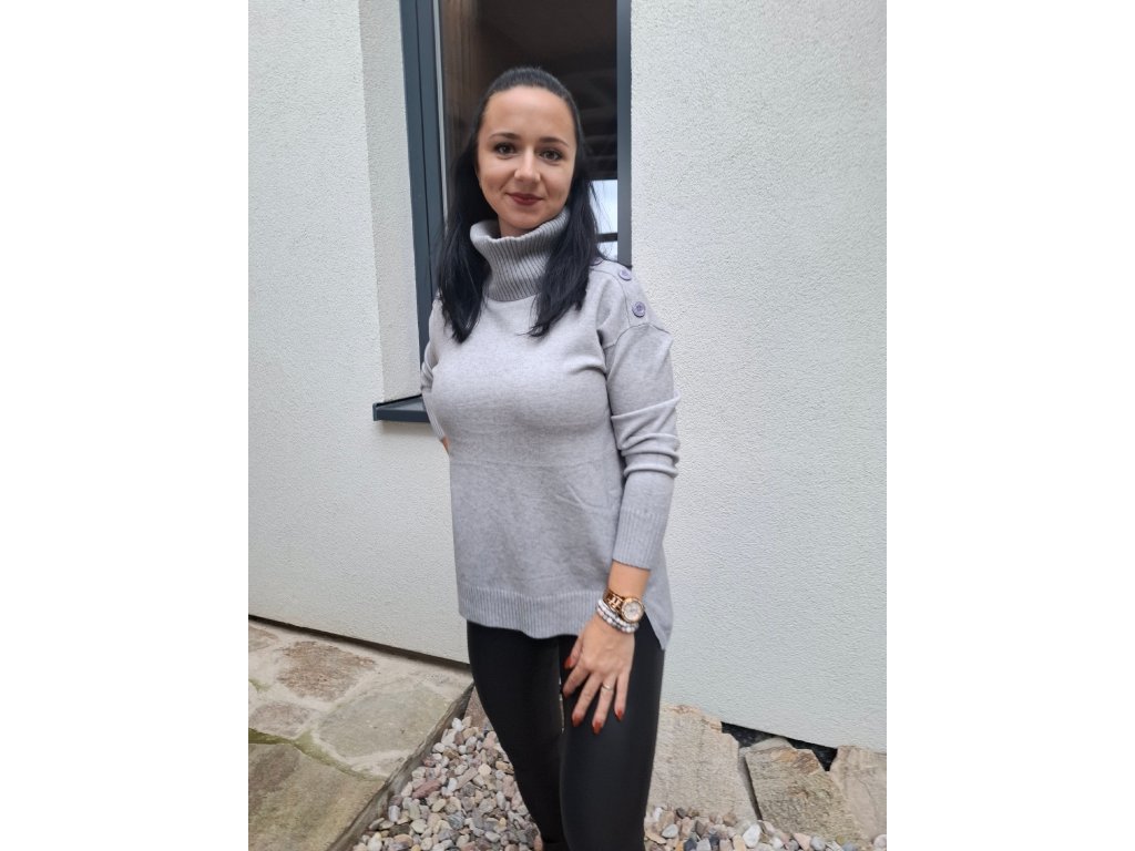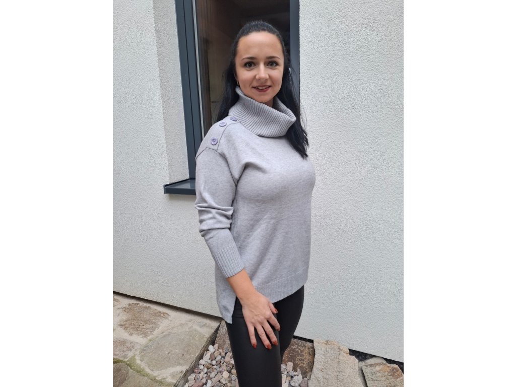 Stylový dámský svetr s rolákem je perfektním kouskem pro chladnější dny. Díky příjemnému materiálu (50% viskóza, 28% polyester, 22% modal) se skvěle nosí, je hebký na dotek a zároveň si dlouho zachová svůj tvar. Originální detail v podobě knoflíků na rameni dodává svetru elegantní nádech, který se hodí jak pro každodenní nošení, tak i pro ležérní elegantní outfit. Svetr má pohodlný střih s rozparky na bocích, který se krásně přizpůsobí postavě.
