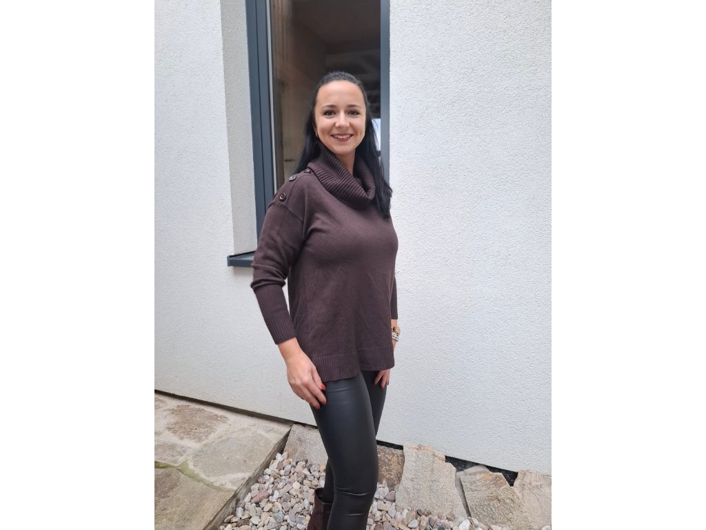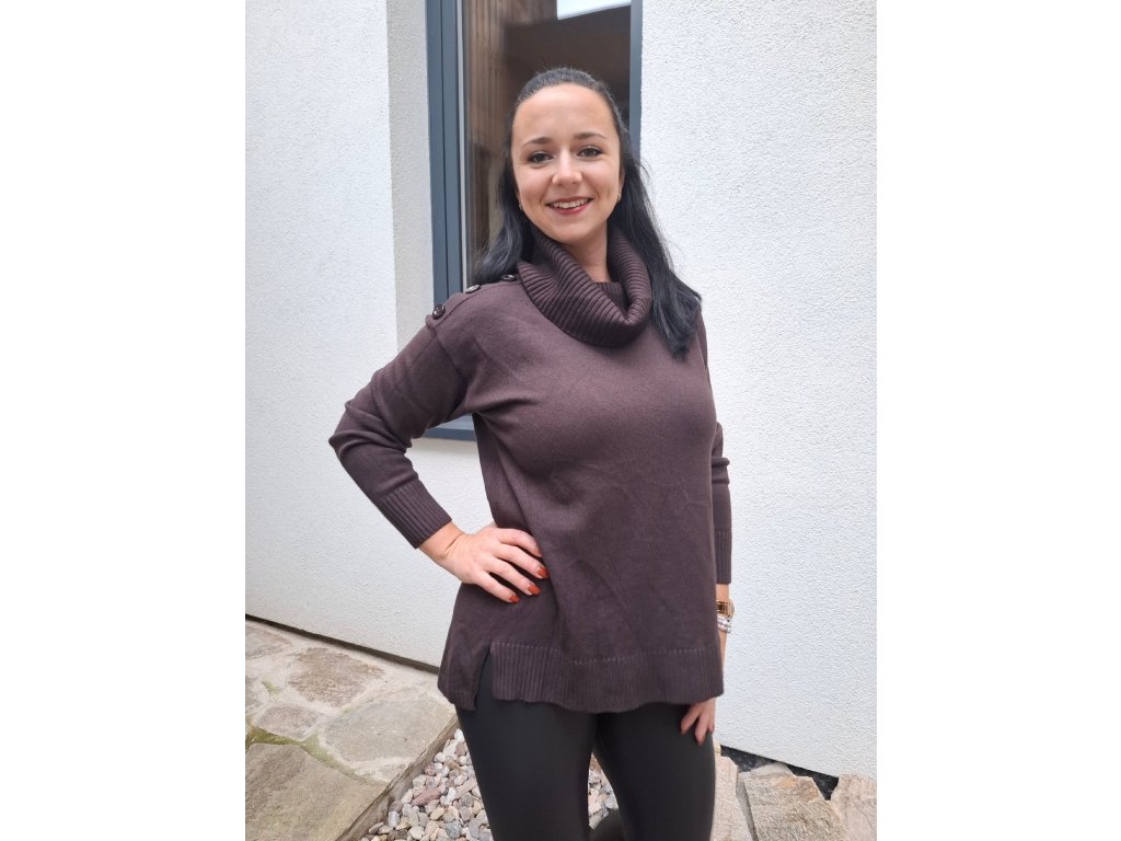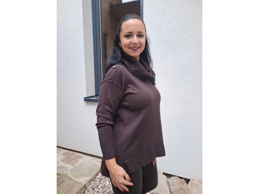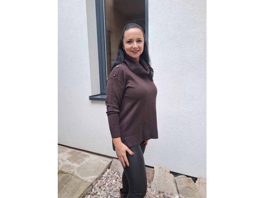 Stylový dámský svetr s rolákem je perfektním kouskem pro chladnější dny. Díky příjemnému materiálu (50% viskóza, 28% polyester, 22% modal) se skvěle nosí, je hebký na dotek a zároveň si dlouho zachová svůj tvar. Originální detail v podobě knoflíků na rameni dodává svetru elegantní nádech, který se hodí jak pro každodenní nošení, tak i pro ležérní elegantní outfit. Svetr má pohodlný střih s rozparky na bocích, který se krásně přizpůsobí postavě.