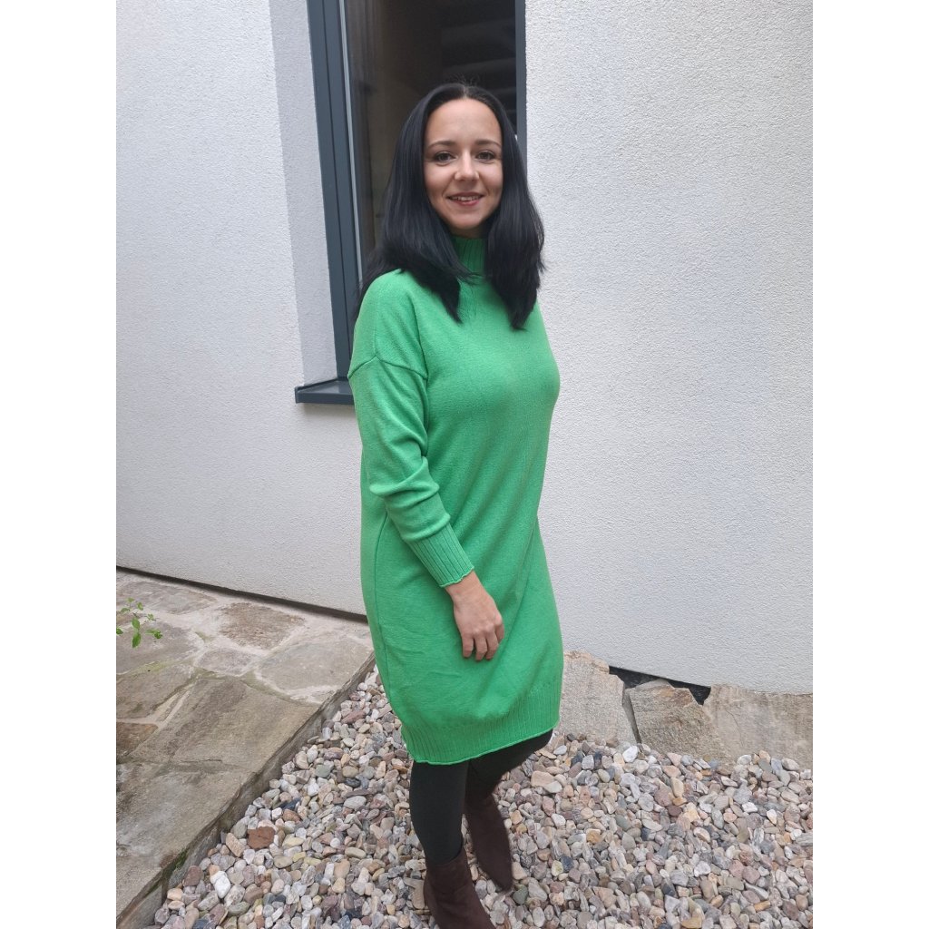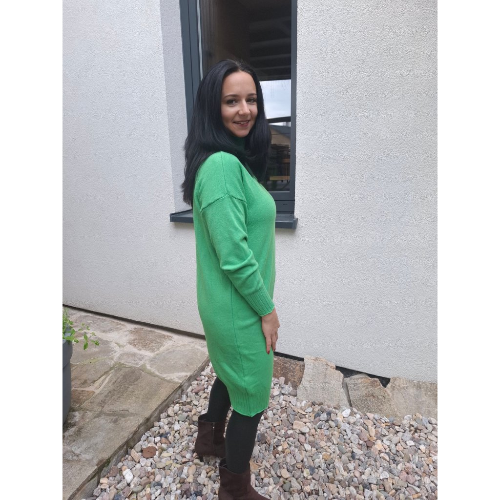 Elegantní svetrové šaty se stojáčkem a dlouhým rukávem, ve spodní části lehce zúžené s delším nápletem. Univerzální velikost vhodná na S–XL. Rozměry: prsa 110–124 cm, délka 100 cm. Materiál: 52% viskóza, 22% nylon, 20% PBT.