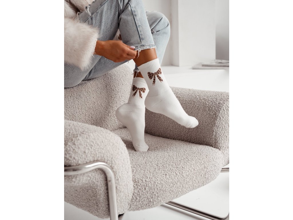 Díky překlápěcí manžetě bez tlaku se skvěle hodí i pro osoby s citlivější pokožkou nebo problémy s krevním oběhem. Jemný detail v podobě mašličky s leopardím vzorem dodává ponožkám ženský a hravý nádech.